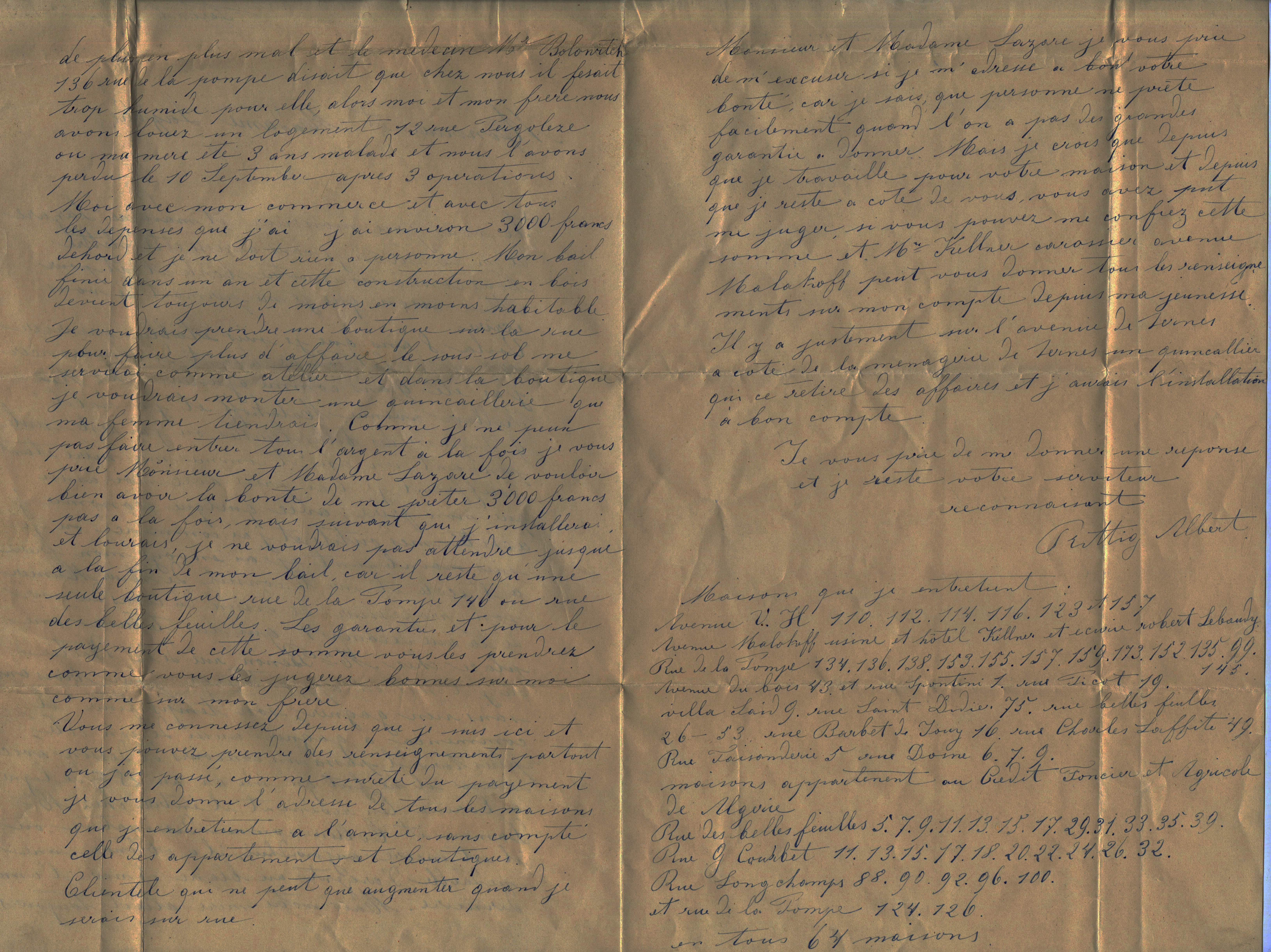 Comme nous venons de le voir, les correspondants du bureau d’assistance peuvent se trouver dans des situations d’une extrême précarité, mais d’autres profils d’apparence plus aisés viennent également chercher de l’aide auprès de M. Lazard et de son épouse. C’est le cas d’Albert Rittig, serrurier rue de la Pompe et précédemment ajusteur chez M. Kellner, avenue Malakoff. Après le décès de sa mère, il souhaite ouvrir une quincaillerie où il habiterait avec sa femme pour quitter son logement en bois qui « devient toujours de moins en moins habitable ». Il demande un prêt pour entreprendre, par lettre du 16 novembre 1895. Grace au prêt, il parvient à monter son affaire et loue même l’étage de la maison qu’il a achetée. Hélas, deux ans plus tard, il fait face à d’importantes difficultés financières. La boutique vend moitié moins et il ne loue plus, car « tout le monde est à la campagne ». Nous sommes en effet le 30 août 1897 et une partie de la main d’œuvre parisienne d’origine rurale est repartie pour la moisson. De ce fait, les commerçants et petits propriétaires qui vivent en leur vendant des biens ou en leur louant des logements traversent des périodes difficiles. Albert Rittig avoue son ignorance et écrit : « Je croyait jusqu’au dernier moment que j’arriverais tout seul à traverser cette morte saison que je ne connaissais pas », puis il regrette de s’être lancé dans une telle entreprise, pour laquelle il n’avait pas assez d’économies, avant de demander un autre prêt : « Je vous supplie de ne pas me juger pour un malhonnête homme, car ci j’avais su, je n’aurais pas commencé un si grand commerce avec si peu de fond ». Ainsi, même avec une aide, sortir de la pauvreté n’est souvent que temporaire.