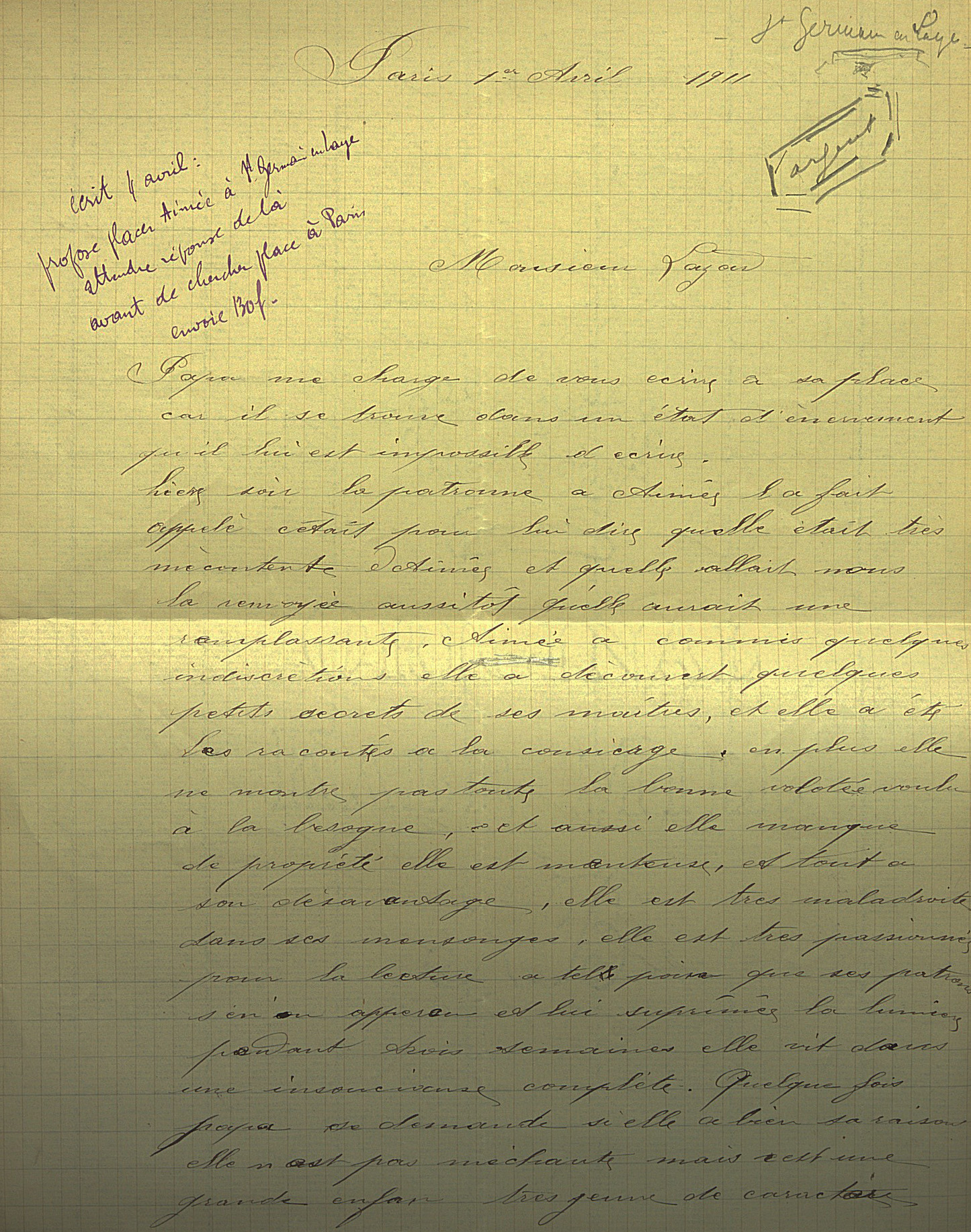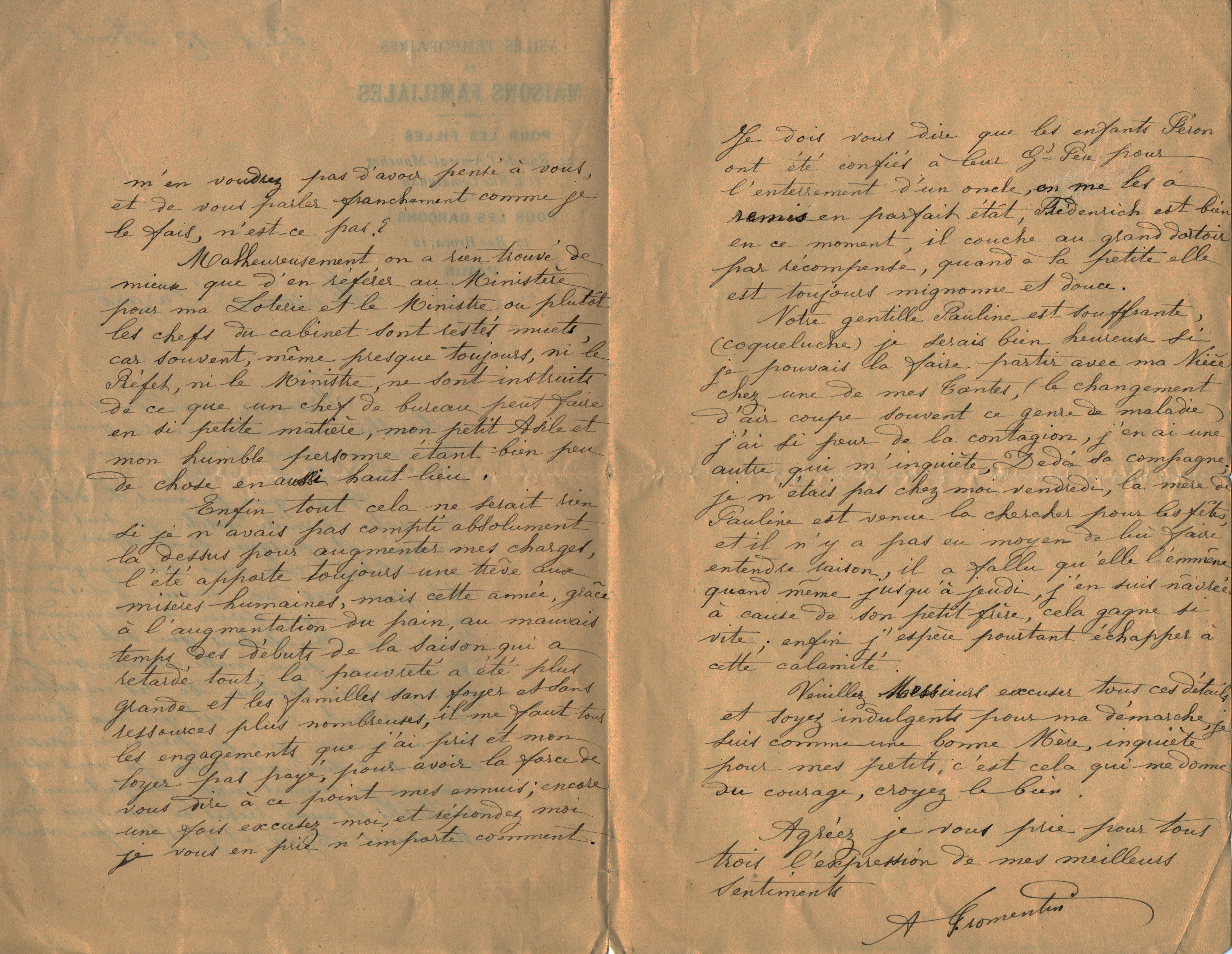 Ce salaire n’est malheureusement qu’un sursis et son épouse écrit elle aussi à Max Lazard le 24 juin 1898. Elle annonce une terrible nouvelle. Sa petite fille vient de mourir et son mari n’a pas de pantalon pour se rendre à l’enterrement, ayant privilégié l’achat d’une paire de chaussures pour son fils : « Monsieur, je vous prie de me pardonner si je me permets de vous rappeler que vous m’aviez promis un pantalon pour mon mari. Si vous pouviez me l’envoyer je vous en serais bien reconnaissante car il n’en a pas pour aller reconduire notre chère petite à sa dernière demeure ».