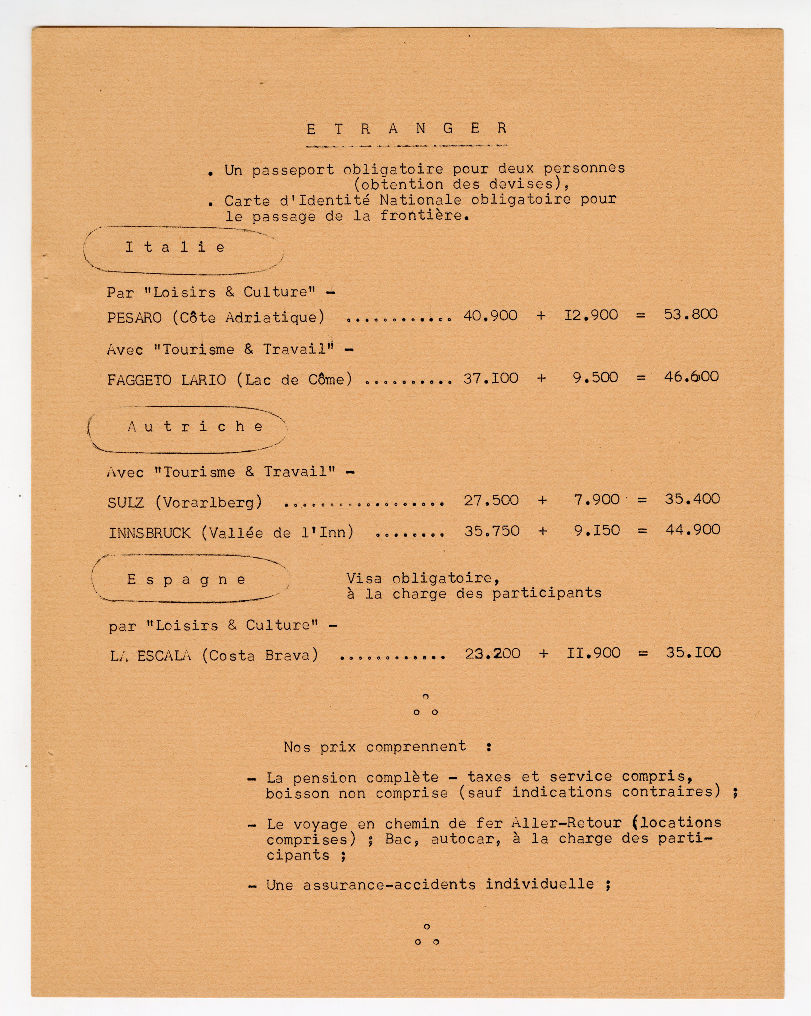 De manière plus classique pour un CE, l’association Loisirs et culture propose une vaste offre de séjours de vacances pour les employés de Renault. Ainsi, en 1960, ces derniers avaient le choix entre des séjours en hôtel, en maison de vacances ou en village vacances en Provence, au bord de la Méditerranée voire à l’étranger.